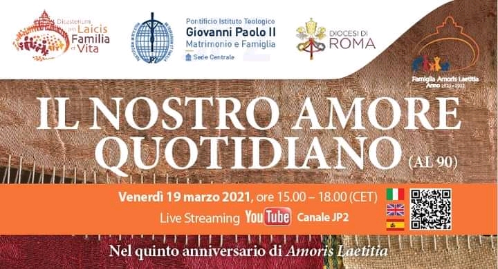 El 19 de marzo, fiesta de San José, organizado por el Dicasterio para los Laicos, la Familia y la Vida, la Diócesis de Roma y el Pontificio Instituto Teológico Juan Pablo II se desarrollará el evento online “Nuestro amor cotidiano”, para abrir el año dedicado a la familia con motivo del quinto aniversario de la publicación de Amoris Laetitia. Se transmitirá en YouTube y tendrá la participación del Papa Francisco.