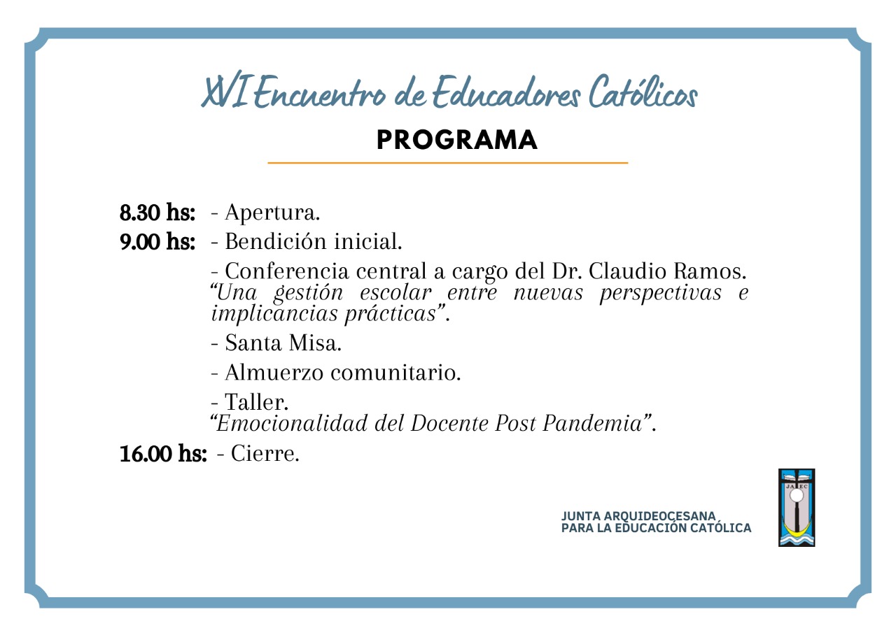 Este viernes se desarrollará el XVI Encuentro de Educadores Católicos con el deseo de “Encontrarnos, compartir y celebrar”. Se realizara de 8.30 a 16 en el Instituto Pío XI.
