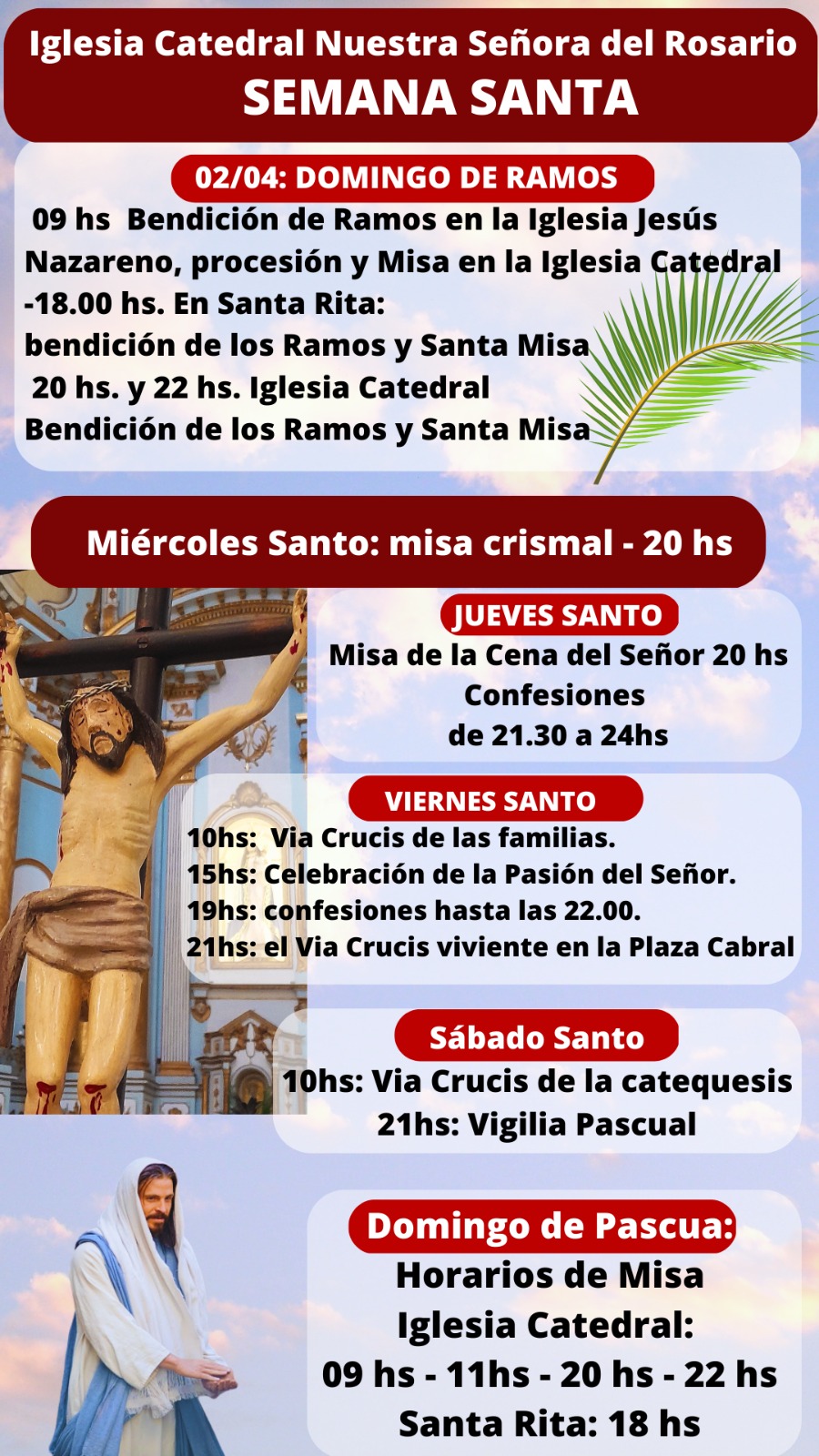 NOTA: las celebraciones del Domingo de Ramos y las del Jueves Santo, se podrán acompañar a través de las páginas de Facebook de: Arquidiócesis Corrientes y Ntra Sra del Rosario Iglesia Catedral Corrientes.