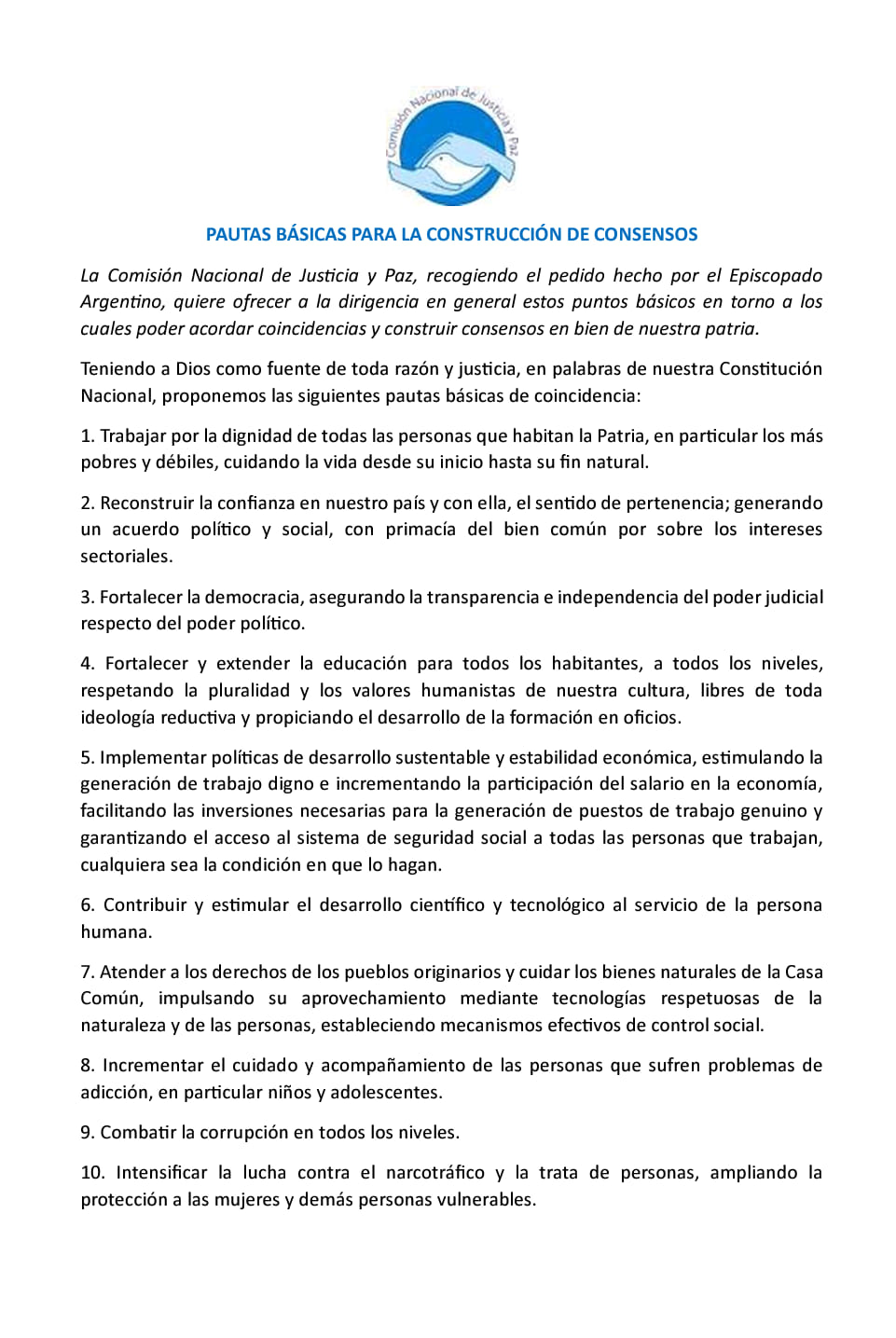 Durante el encuentro, se entregó además a los candidatos, el documento: “Pautas básicas para la construcción de consensos”, elaborado por la Comisión Nacional de Justicia y Paz, como aporte que la Iglesia Católica Argentina ofrece a los frentes electorales en conformación a lo largo y ancho del país (Ver: https://episcopado.org/ver/3771).