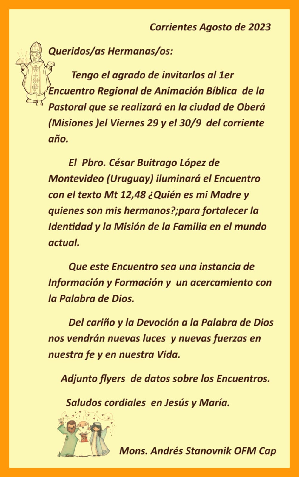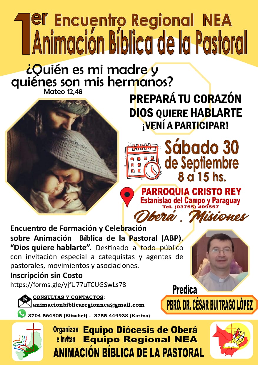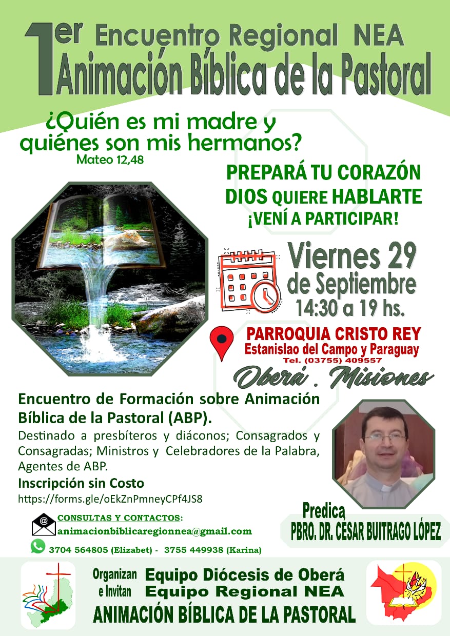 Con gran alegría compartimos la invitación formal al Primer Encuentro Regional de Animación Bíblica de la Pastoral (ABP) del NEA – Argentina, que se realizará en Oberá, Misiones. La prédica de la jornada estará a cargo del presbítero doctor César de Jesús Buitrago López.