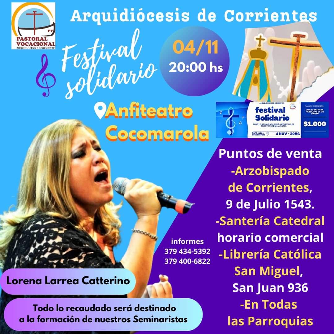 Se viene el Festival Solidario para ayudar al sostenimiento de nuestros jóvenes seminaristas. Se realizará el sábado 4 de noviembre en el Anfiteatro Cocomarola. Reconocidos solistas y conjuntos chamameceros se subirán al escenario para compartir su música, a partir de las 20. Habrá sorteos con importantes premios.