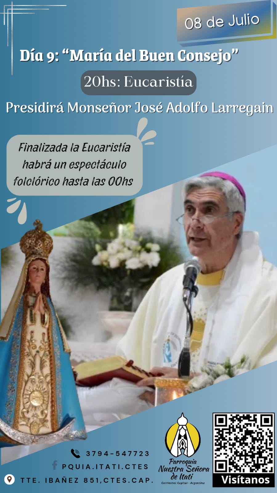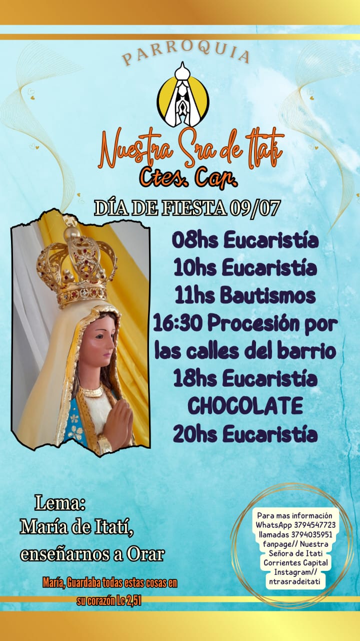 En la ciudad de Corrientes, la Virgen de Itatí es la Patrona de la parroquia ubicada en avenida Teniente Ibáñez y Salta. Allí, con el lema: “María de Itatí, enséñanos a orar”, cierra hoy la novena y se preparan para mañana los festejos en su honor. El Obispo auxiliar presidirá hoy la eucaristía, a las 20.