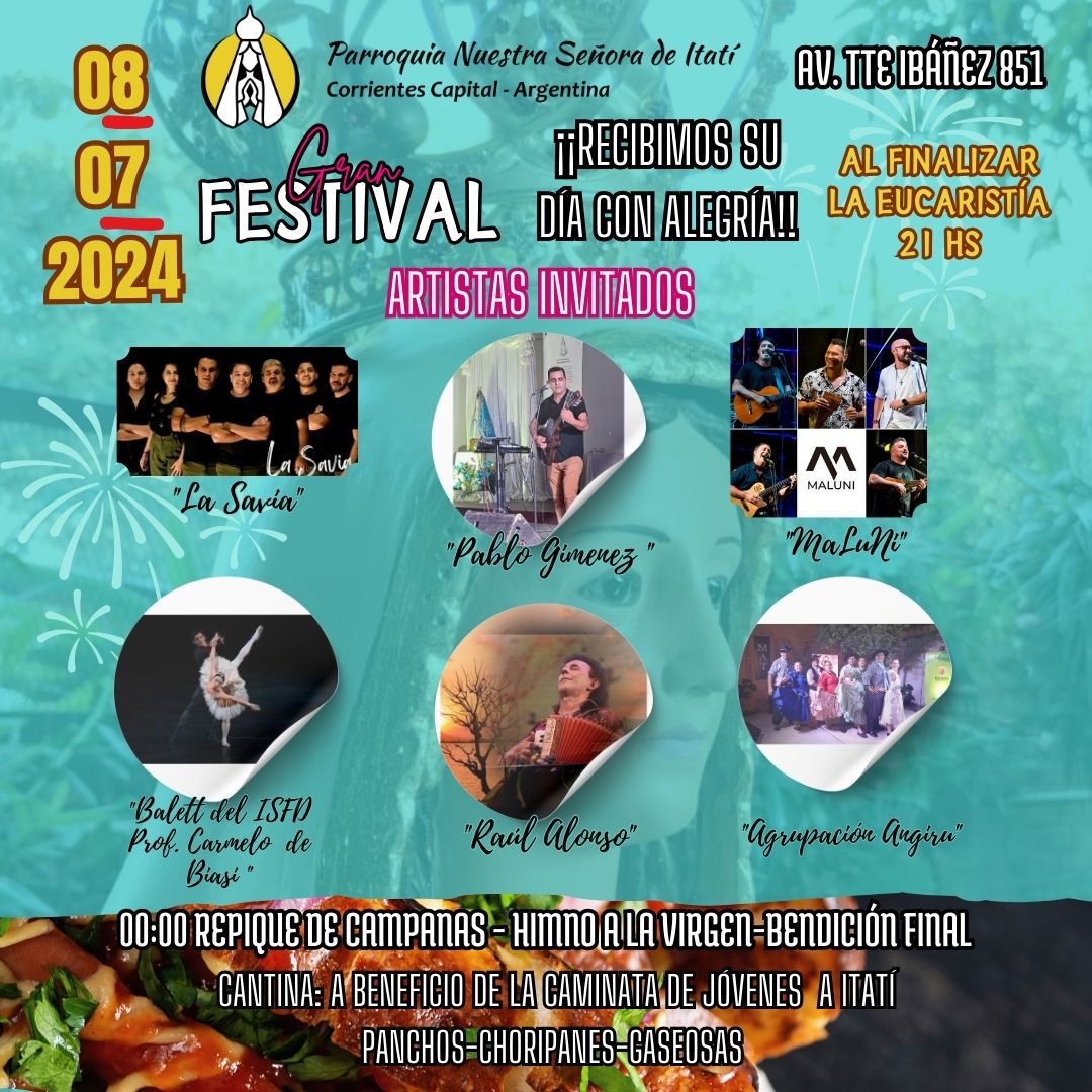 Para recibir el día de la Virgen con alegría, se realizará esta noche el Gran Festival el día 8, luego de la San Misa, a partir de las 21, aproximadamente. Entre los artistas invitados que ofrecerán sus talentos a la Virgen, estarán Pablo Giménez, los grupos MaLuNi y La Savia; estarán además, la Agrupación Angirú y el ballet del ISFD “Prof. Carmelo de Biasi”. Subirá al escenario también, Raúl Alonso.