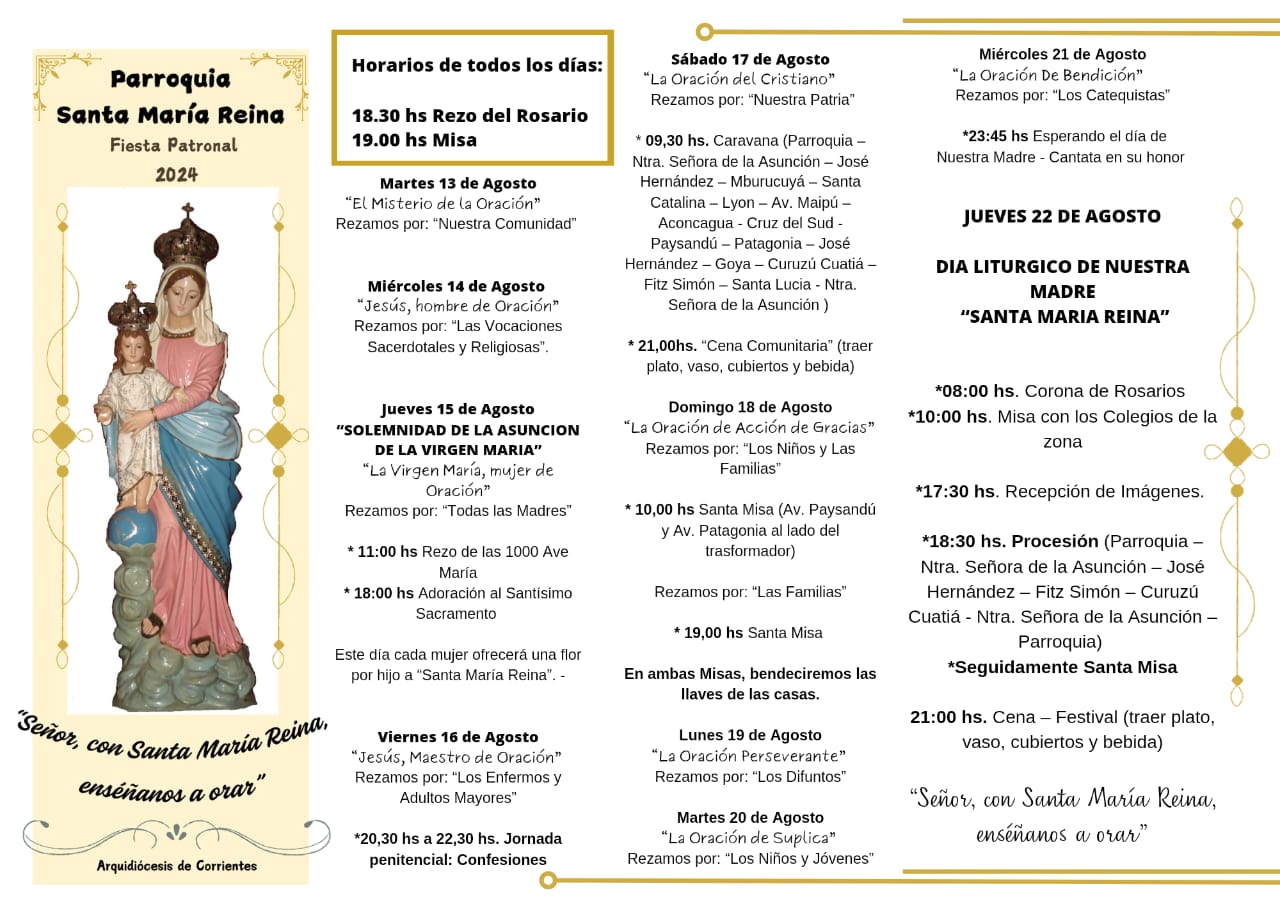 “Señor, con Santa María Reina, enséñanos a orar” es el lema que ilumina este tiempo de festejos en la comunidad. Todos los días de la novena, a las 18.30 se reza el Santo Rosario y a las 19, se celebra la eucaristía. El sábado se realizó una caravana con la imagen de la Virgen y se compartió una cena comunitaria.