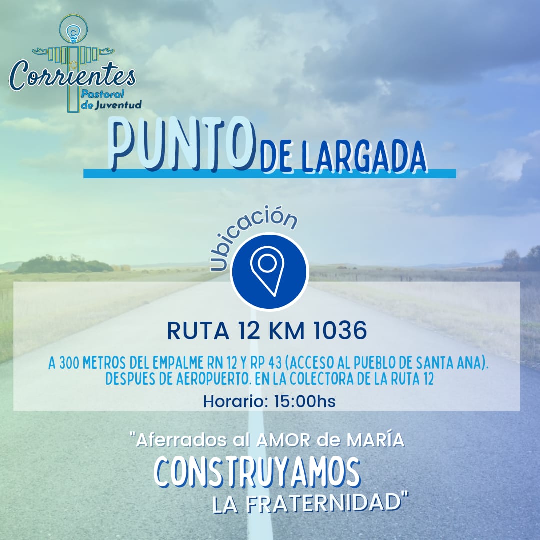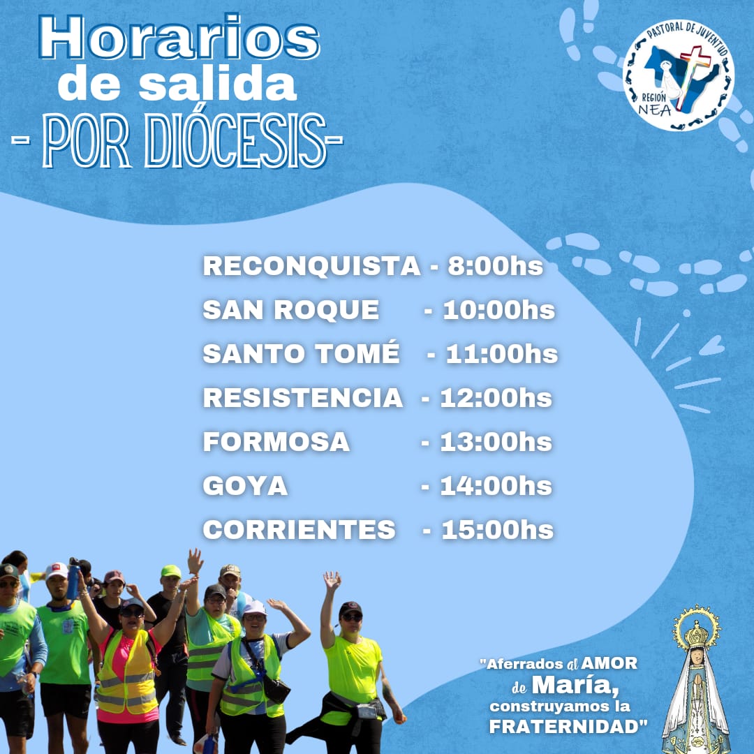 El punto de concentración desde el que irán partiendo las diez diócesis que integran la región pastoral del NEA será sobre RN12 y RP43. Los horarios de salida de las diócesis serán: a las 8, la de Reconquista; a las 10, San Roque; a las 11, Santo Tomé; a las 12, Resistencia; a las 13, Formosa; a las 14, Goya; y a las 15, Corrientes. Las autoridades han diagramando la logística relacionada con la llegada de los contingentes a la ciudad de Corrientes, para luego partir a la casa de la Virgen.