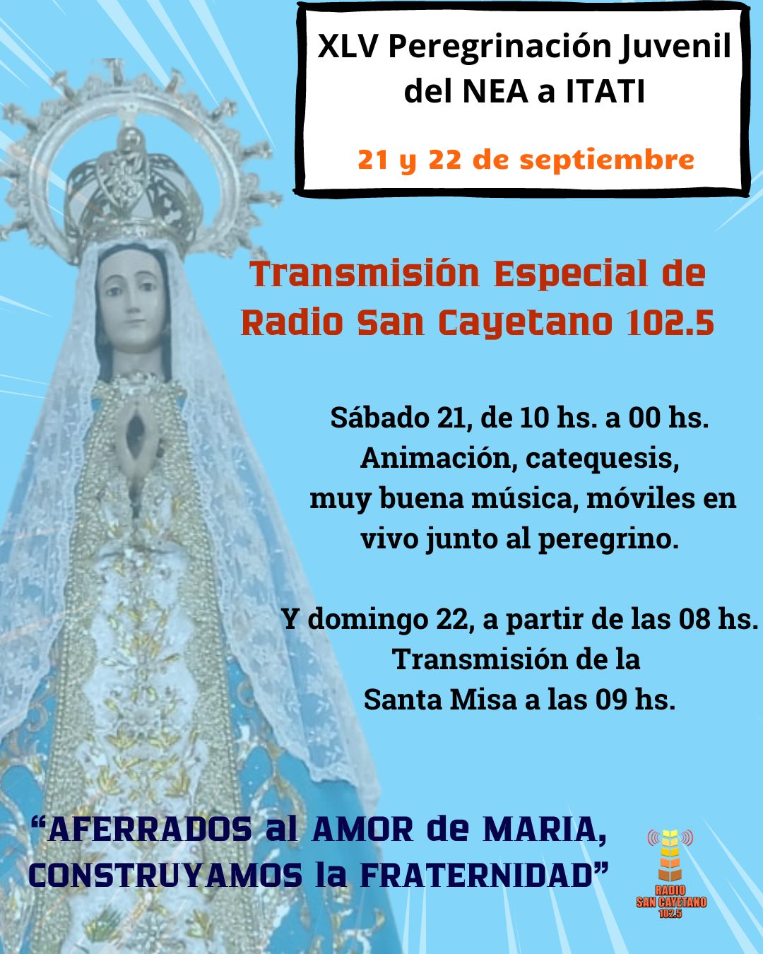 Como todos los años, San Cayetano (102.5 MHZ), la radio del Arzobispado de Corrientes, acompañará a los peregrinos con una transmisión especial que se iniciará el sábado a las 10. Hasta la medianoche estará transitando la ruta junto a los jóvenes, compartiendo con ellos sus experiencias en este acontecimiento de gracia a través de los móviles. Habrá entrevistas desde el estudio, animación, catequesis y buena música para que desde todos los rincones del NEA puedan vivir esta manifestación de fe junto a los que caminan.