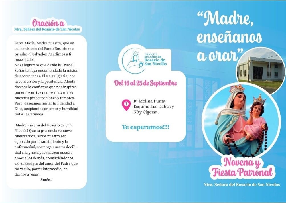 Se están rezando los últimos días de la novena de preparación para la fiesta de Nuestra Señora del Rosario de San Nicolás en la parroquia del barrio Molina Punta. “Madre, enséñanos a orar” es el lema que ilumina este tiempo especial de la comunidad. Los actos centrales se vivirán el 25, y serán presididos por el Obispo auxiliar.