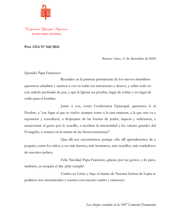 Como todos los años, los Obispos enviaron una carta al Papa Francisco, en la que le expresan su cercanía en relación con sus intenciones y deseos, sobre todo en cuanto "al anhelo profundo de paz; para que la Iglesia sea pesebre y lugar de cobijo".