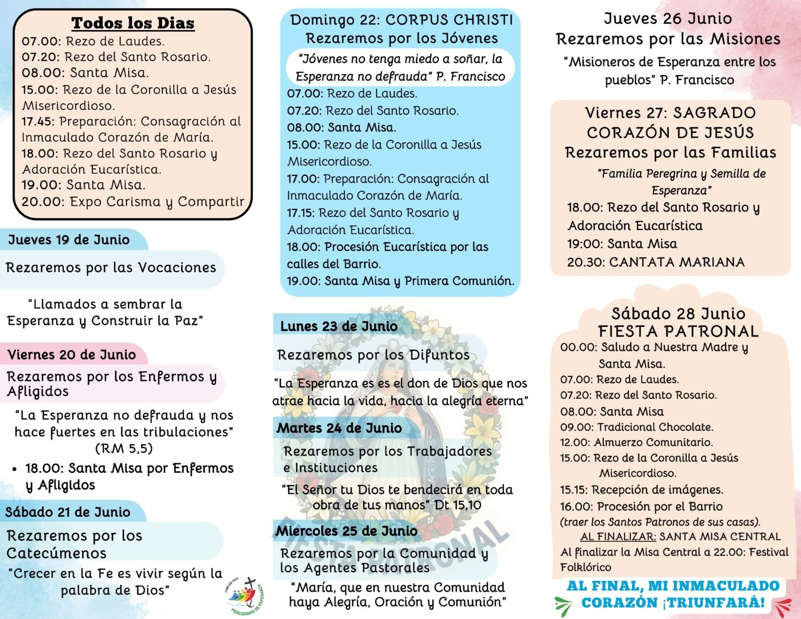 Durante la novena, todos los días, a las 7, se reza Laudes y luego el Santo Rosario, se celebra la misa a las 8. Por la tarde, a las 15, rezo de la Coronilla a Jesús Misericordioso; a las 17.45, preparación para la consagración al Inmaculado Corazón de María; a las 18, Santo Rosario y adoración al Santísimo Sacramento. A las 19, Santa Misa y a las 20, Expo Carisma.