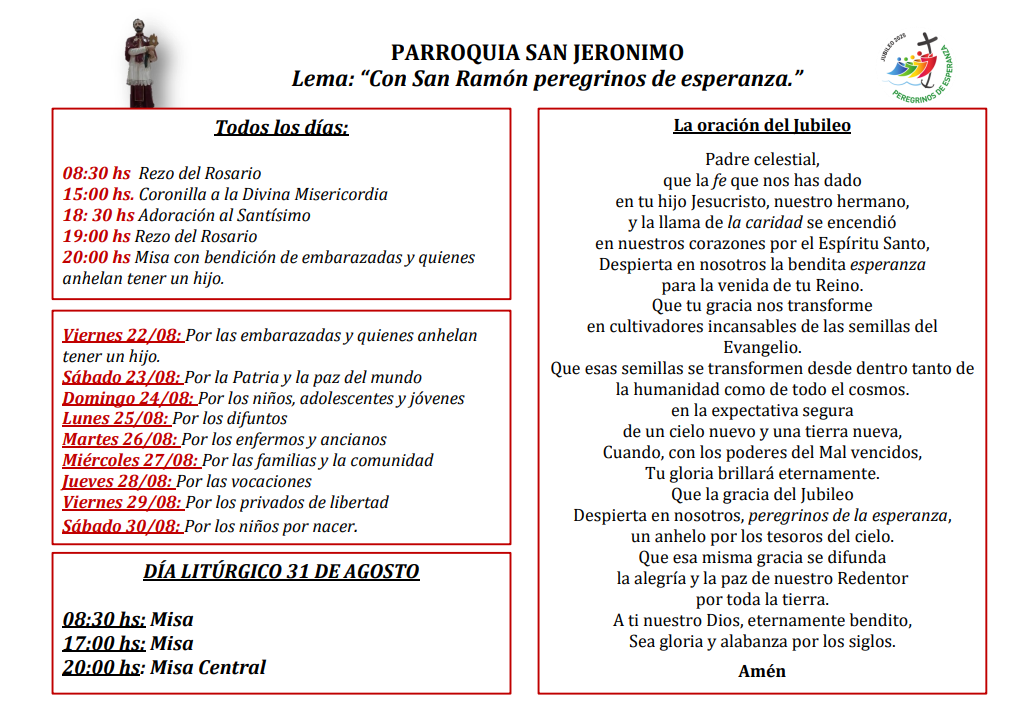 La fiesta litúrgica de San Ramón Nonato será el domingo 31 de agosto con la celebración de misas a las 8.30 y 17. La misa central se celebrará a las 20.