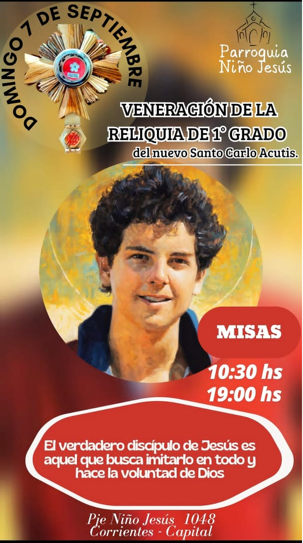 El domingo, en Niño Jesús (Pasaje Niño Jesús 1048) será venerada la reliquia de primer grado de Carlo Acutis. Desde las 13 y a las 18,30 habrá adoración al Santísimo Sacramento, con el relicario expuesto y la imagen de Nuestra Señora de Fátima. Además, se invita a compartir la celebración eucarística, habrá Misas a las 10.30 y a las 19. Terminada las celebraciones eucarísticas, se va a hacer una procesión de las reliquias entre la gente y una bendición Solemne.