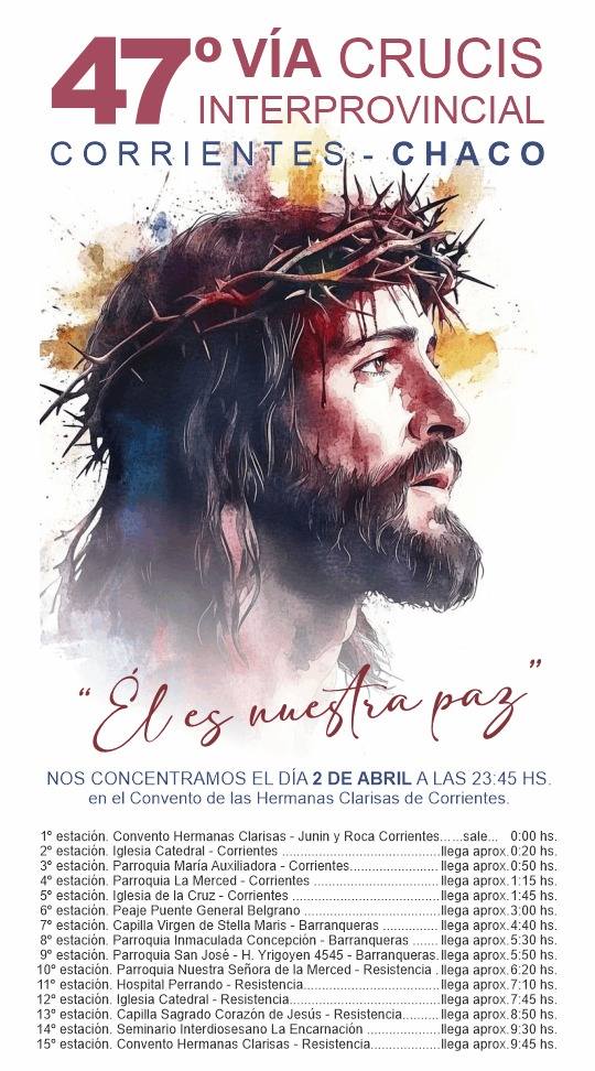 Iluminado por el lema “Él es nuestra paz”, se realizará el próximo 2 de abril el 47° Vía Crucis Interprovincial Corrientes – Chaco, una tradicional manifestación de fe que convoca a fieles de ambas provincias a recorrer juntos el camino de la cruz. Este año se iniciará en la capital correntina.