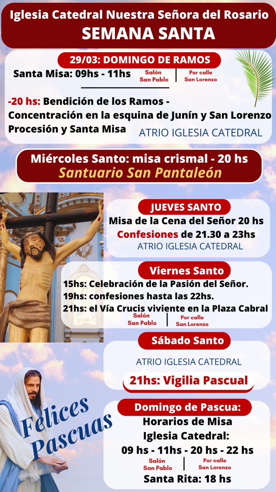 El 29 de marzo, la celebración de Domingo de Ramos será a las 20, con la bendición de las palmas en la esquina de calles Junín y San Lorenzo, desde allí se caminará en procesión hasta el atrio de la Iglesia Catedral donde monseñor José Adolfo Larregain presidirá la eucaristía.