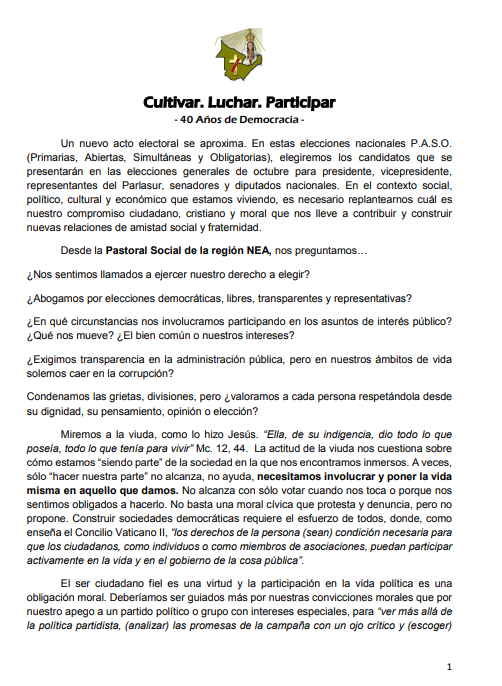 “Cultivar. Luchar. Participar”, mensaje de la Pastoral Social del NEA
