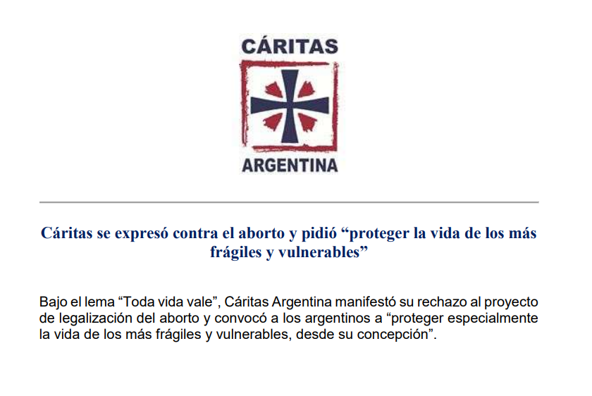 Cáritas se expresó contra el aborto y pidió “proteger la vida de los más frágiles y vulnerables”