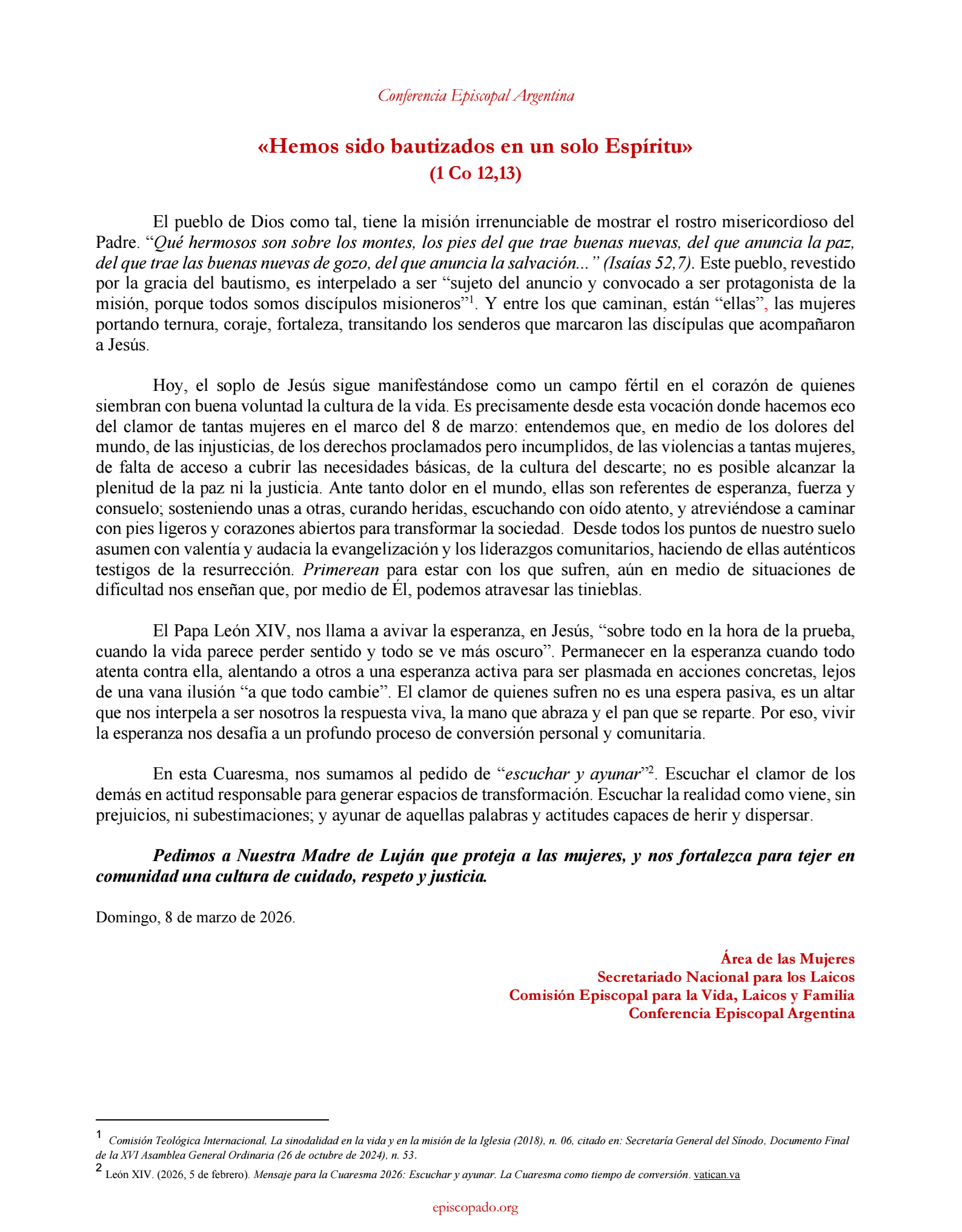[2] León XIV. (2026, 5 de febrero). Mensaje para la Cuaresma 2026: Escuchar y ayunar. La Cuaresma como tiempo de conversión. vatican.va